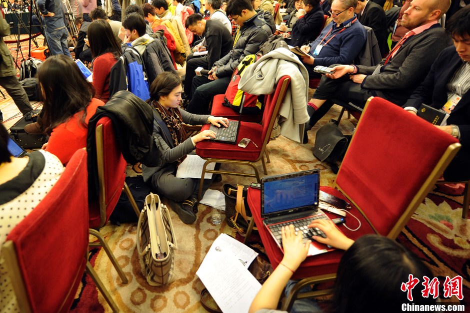 2012全国“两会”期间,一名记者在记者会上打出:“问省长”的字样争取提问机会。中新社发 吴峻 摄 图片来源:CNSPHOTO