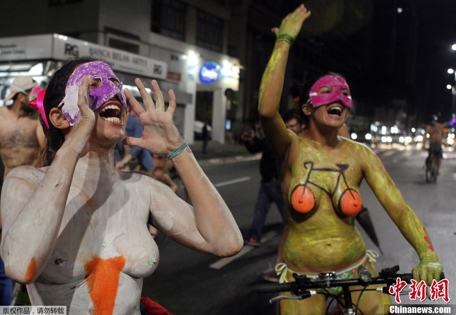 当地时间3月10日,巴西圣保罗,人们参加裸体骑自行车活动,呼吁保障骑车者的权益,倡导绿色出行方式。