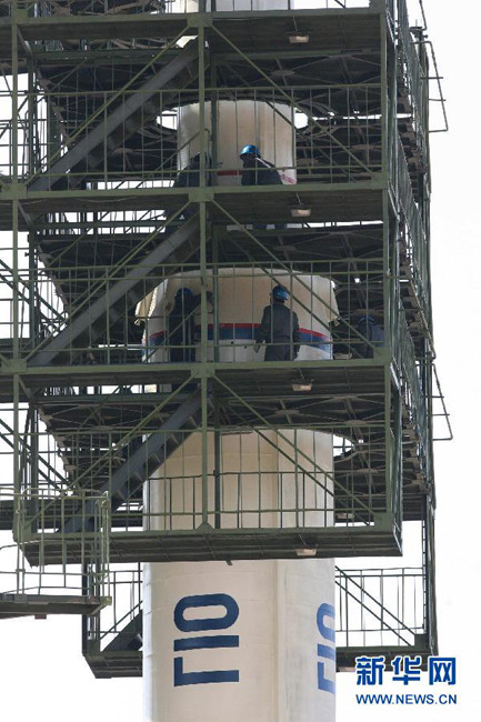 这是4月8日在朝鲜平安北道铁山郡东昌里的“西海卫星发射场”拍摄的工作人员现场展示的即将发射的“光明星3号”地球观测卫星。新华社记者张利摄 图片来源:新华网