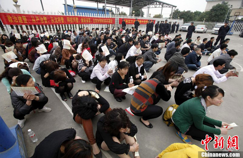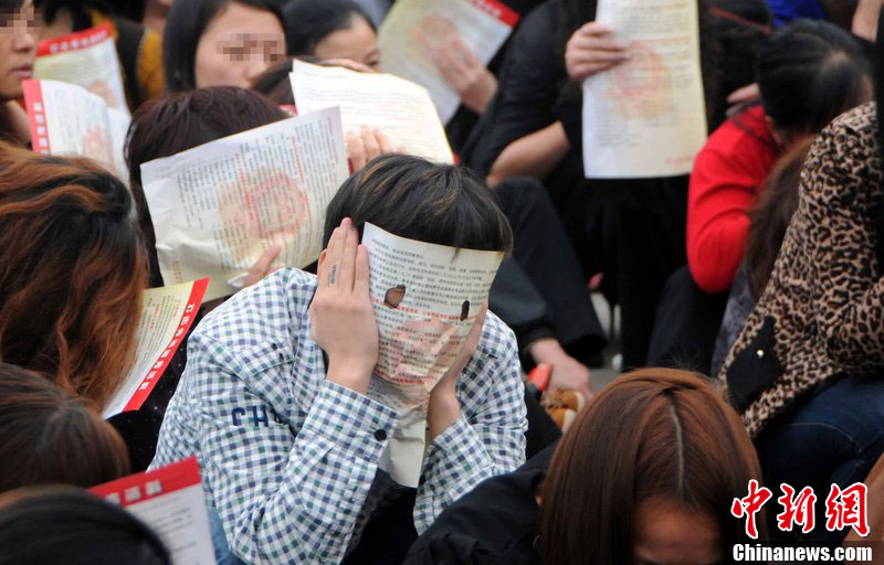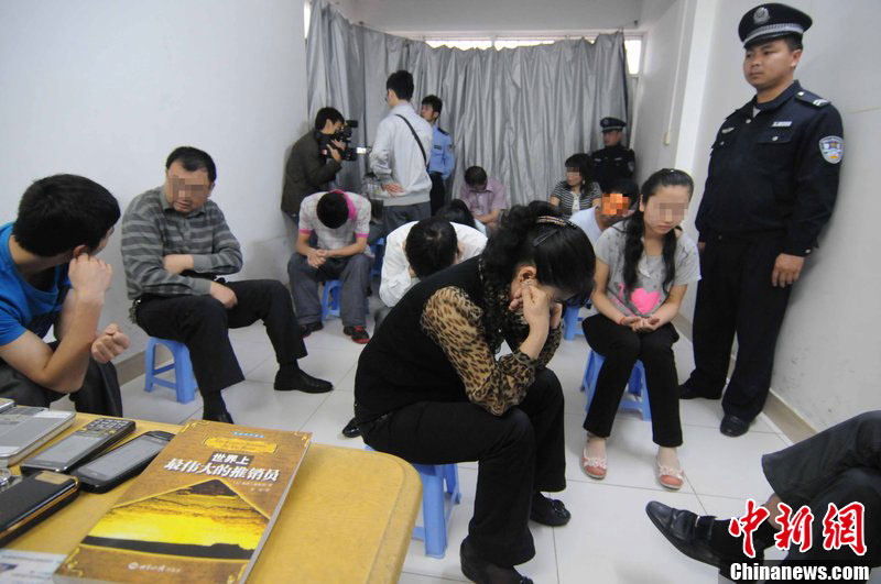 4月7日,南宁警方集结,开展2012打击传销集中清查整治行动。据悉,从即日起至6月30日,国家工商总局、公安部共同开展严厉打击传销违法犯罪专项行动。行动期间,每个重点省(区)要组织两次以上统一行动或集群战役,力争侦破5起以上重大“拉人头”和网络传销案件,打掉10个百人以上犯罪团伙,捣毁百个十人以上窝点,并把追缴涉案资产作为首要任务。图为被抓获的传销者集中等待警方调查。宋兵甲 摄 图片来源:CFP视觉中国