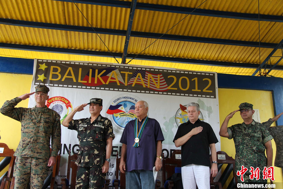 4月22日,美国与菲律宾“肩并肩2012”联合军演在菲南部巴拉望省首府普林塞萨港市继续进行。图为美国海军陆战队在菲武装部队西部军区司令部停机坪上进行消防演练,迅速扑灭机场上的熊熊大火。中新社发 张明 摄