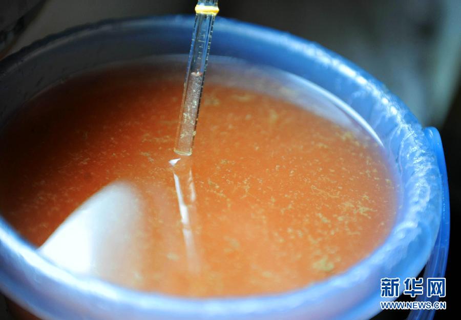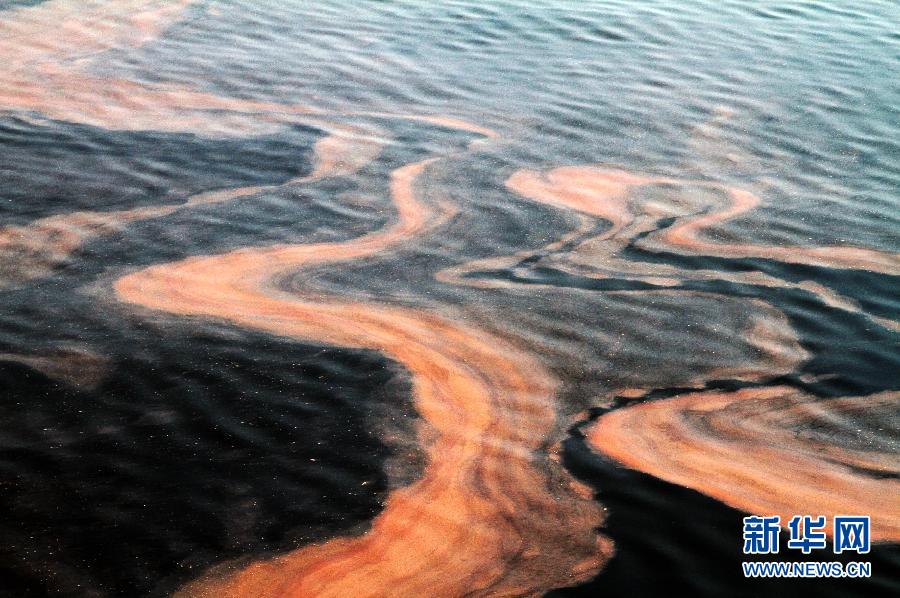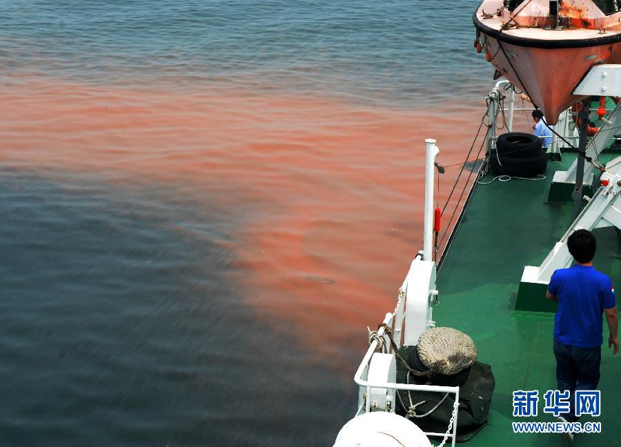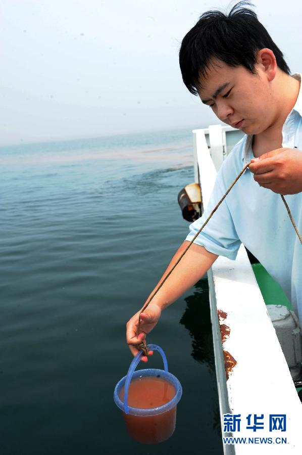 赤潮密集区域夜光藻分布较为密集,呈砖红色(5月7日摄)。近日,山东日照附近海域出现大面积赤潮,并逐步向西北方向飘移。国家海洋局北海分局连日来在山东日照附近海域利用卫星、海监飞机进行赤潮面积确认,开展漂移预测,并对责任海域赤潮进行船舶跟踪监视监测。据国家海洋局北海分局5月6日综合卫星、飞机和船舶赤潮监视监测结果,山东日照附近海域赤潮总分布面积为42.7平方公里,距离日照近岸最近19公里左右。共发现5块赤潮,呈红色,条带状分布。经采样分析鉴定为夜光藻赤潮,平均密度约32000个/L。赤潮海域夹杂部分白色条带,属赤潮消退残留。目前,国家海洋局北海分局已通报相关部门,做好责任海域赤潮的跟踪监视监测,及时通知养殖户做好赤潮防范工作。 5月7日,记者随国家海洋局北海监测中心工作人员乘船在山东日照海域搜寻采访,拍摄了海上追踪日照赤潮的照片。 新华社记者 李紫恒 摄 图片来源:新华网