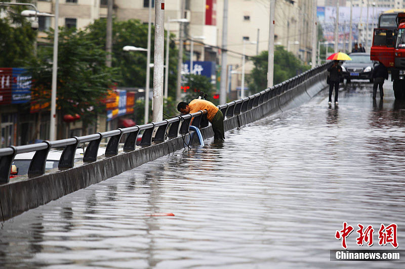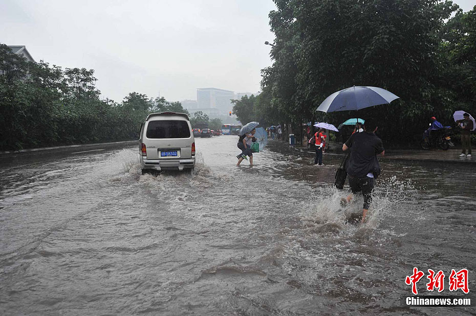 5月21日,重庆主城区迎来一场暴雨,导致当地主城多地积水严重,路人只能淌着水走路,车辆缓慢通过积水路段。图为交巡警正全身湿透,挽着裤腿站在积水中央疏导交通。陈超 摄