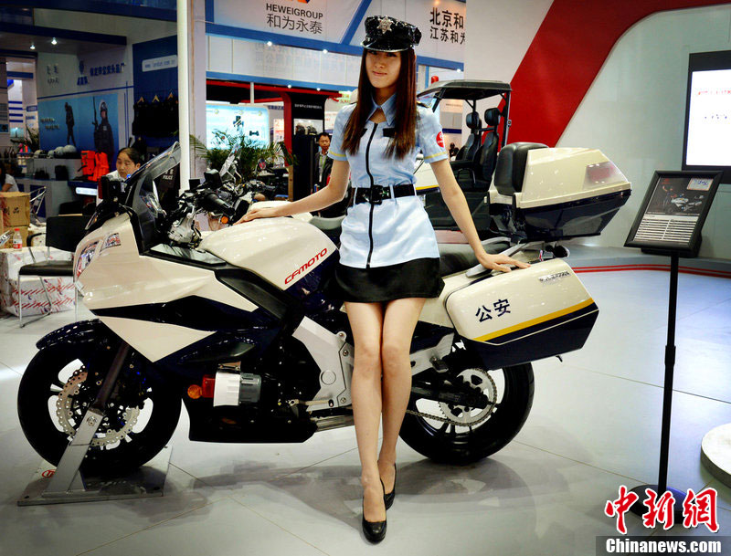 5月24日,在北京国家会议中心举办的“第六届中国国际警用装备博览会”热闹非凡。展览现场的美女“警察”展示警用摩托车。MARK RALSTON 摄 图片来源:东方IC 版权作品 请勿转载