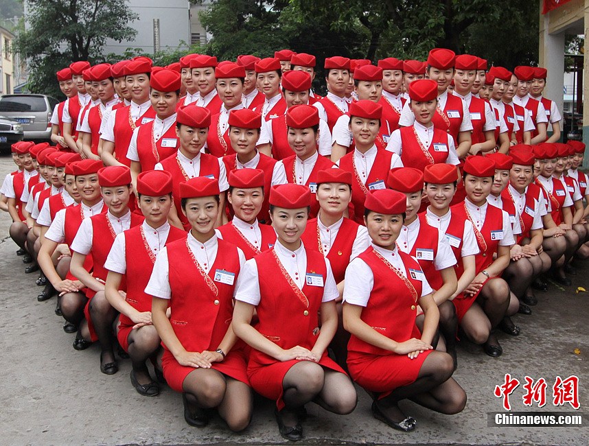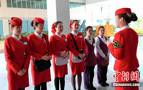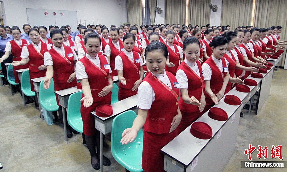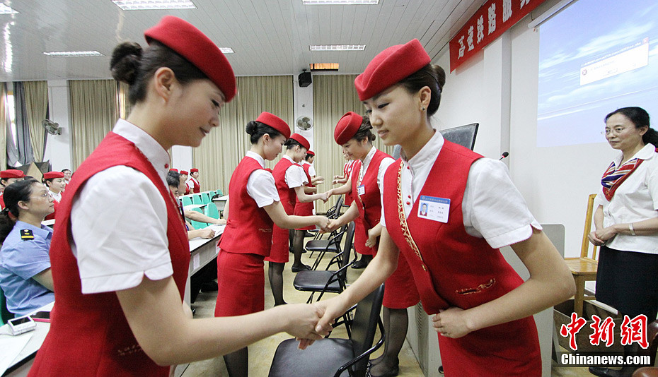 6月13日,福州客运段动车组乘务员在进行职业素养、服务技能的培训。礼仪培训老师指导“动姐”展示迎宾的规范手势。龙厦动车开通在即,福州客运段组织现有动车组乘务员和新招聘的“动姐”进行培训,提高动车服务水准。中新社发 雍万俊 摄
