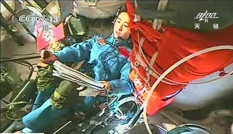 6月16日,神舟九号飞船入轨后,进行第二圈飞行时,景海鹏打开了返回舱和轨道舱的舱门。三位航天员在轨道舱内将白色的航天员舱内压力服装改为蓝色的航天员舱内工作服。随后地面人员和3名刚入轨的航天员进行了第一次通话。图为景海鹏进入轨道舱。(电视截图)