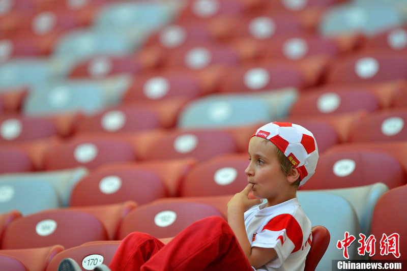 都说足球是男人的运动,近年来女人们也抢了不少风头,但足球场依然还有另外一道风景线——可爱的娃娃球迷,他们可爱的扮相增添了足球的无限魅力。图为当地时间2012年6月8日,乌克兰小男孩坐在地上观看波兰对阵希腊的比赛。图片来源:东方IC 版权作品 请勿转载