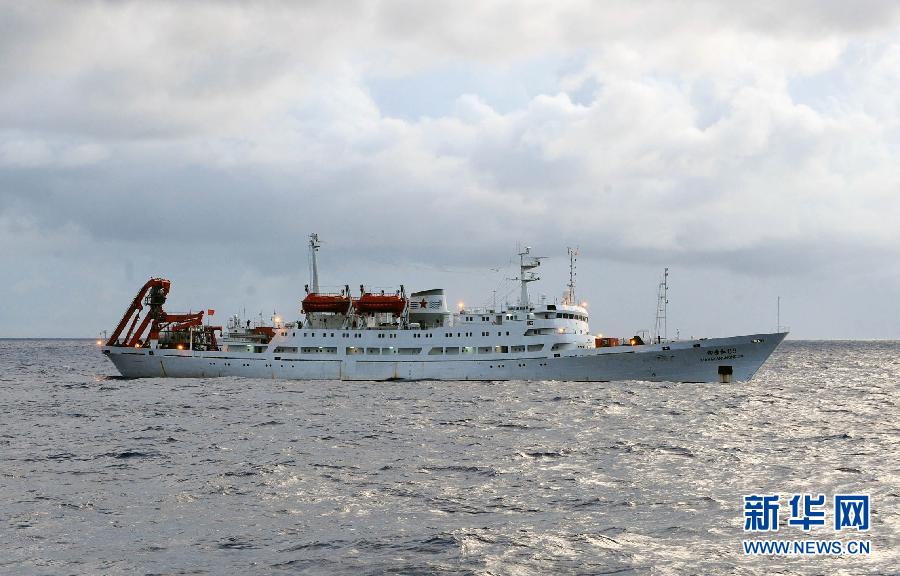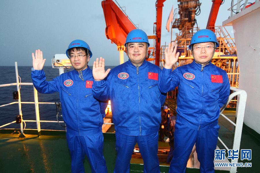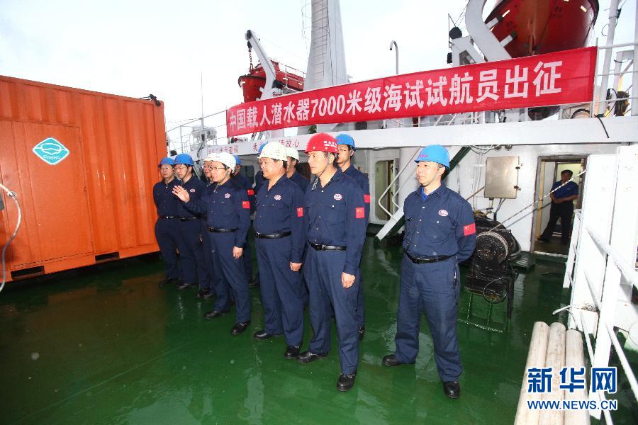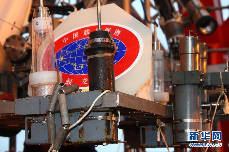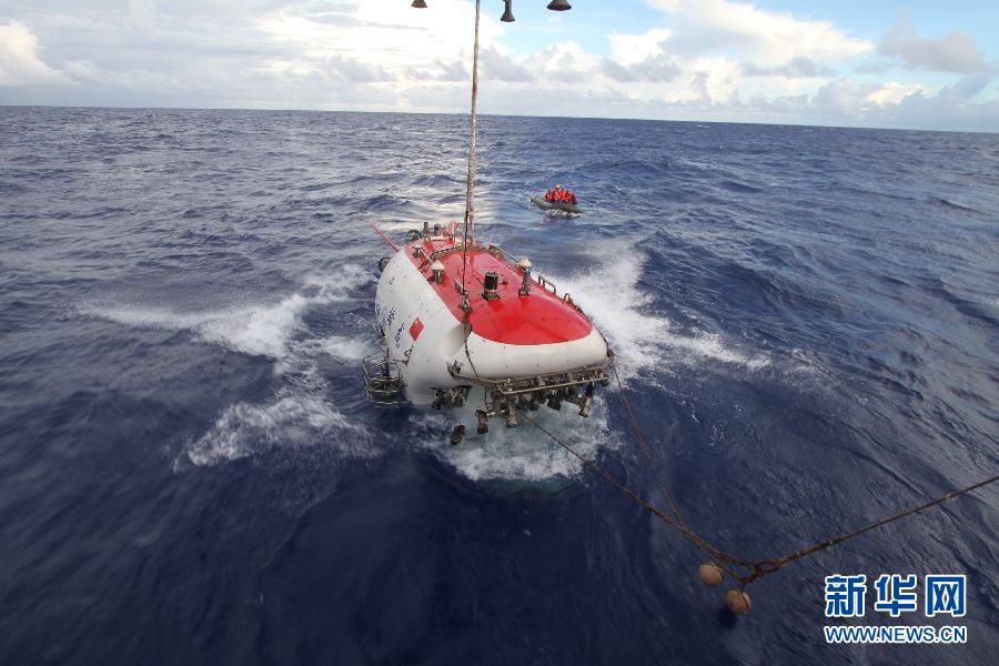 6月24日,“蛟龙”号载人潜水器在马里亚纳海域进行的7000米级海试第四次下潜试验中成功突破7000米深度,再创我国载人深潜新纪录。图为“蛟龙”号被布放入水(6月24日摄)。罗沙 摄 图片来源:新华网