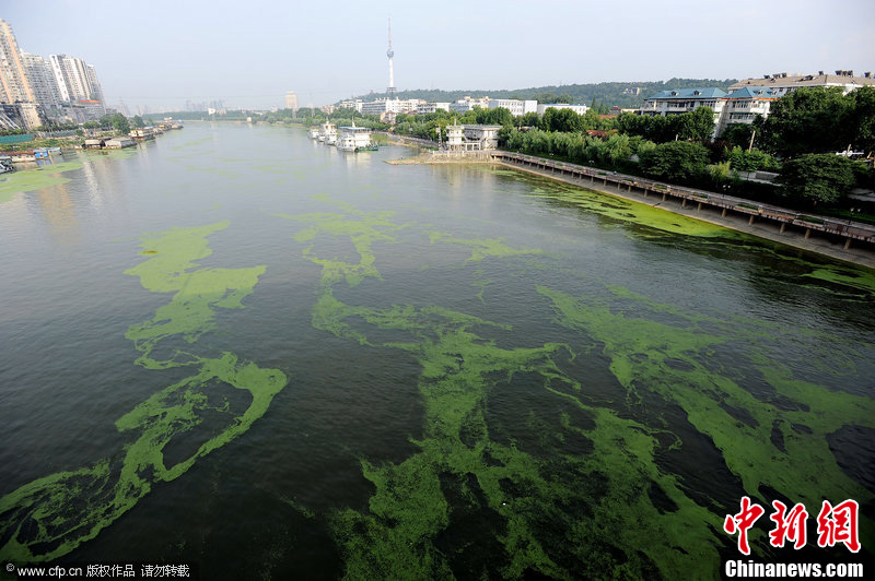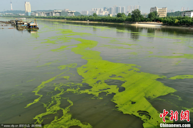 2012年6月29日,汛期来临,汉江武汉段发生水华,大量浮萍流经汉江飘入长江。图片来源:CFP视觉中国