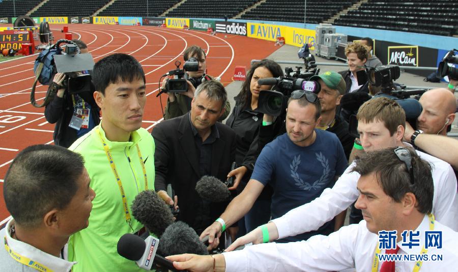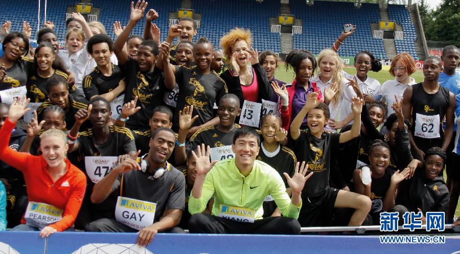 7月12日,刘翔(前排中)、美国著名百米运动员泰森·盖伊(前排左二)与田径迷们合影。当日,刘翔亮相伦敦南部的水晶宫体育场,接受英国和其他国际媒体的采访,并与英国当地小田径迷见面。刘翔将于当地时间7月13日晚在该体育场参加国际田联钻石联赛伦敦站的比赛,这也是他在伦敦奥运会之前的最后一次正式比赛。新华社记者王子江摄 图片来源:新华网
