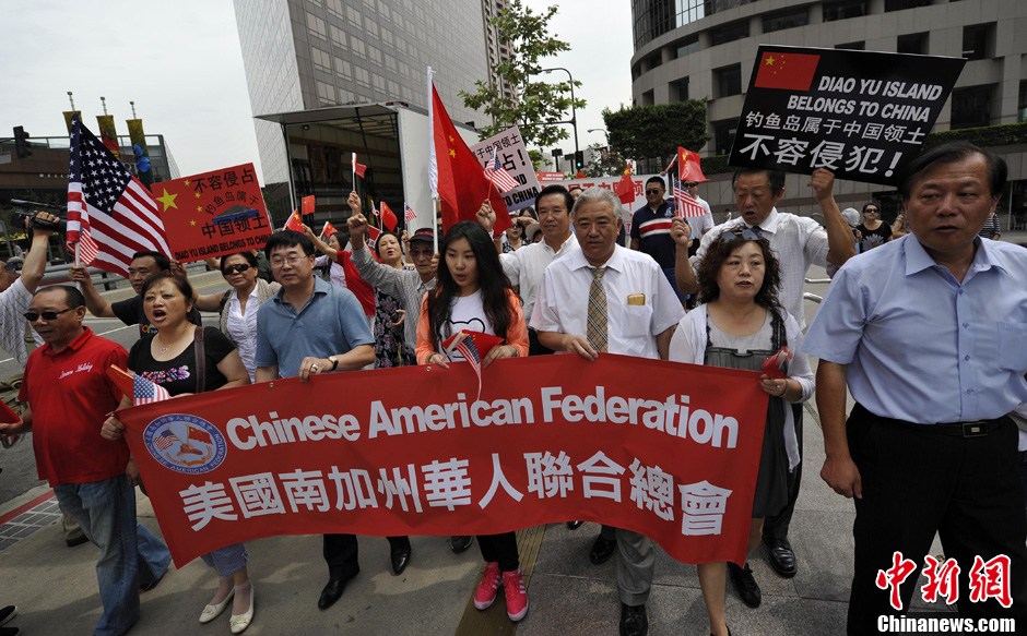 当地时间7月12日,数十名代表在日本驻洛杉矶领事馆楼下高呼“钓鱼岛是中国的”等口号,抗议日本首相野田佳彦就钓鱼岛主权问题作出的荒唐决定,并力图向日本领事馆递交抗议书。中新社发 毛建军 摄