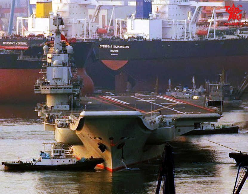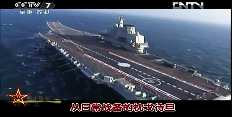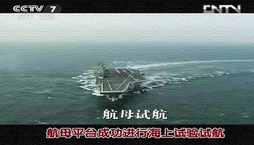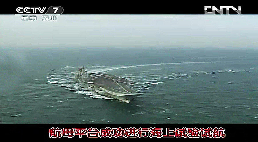 2012年7月16日,在中央电视台晚间节目首次曝光了中国航母平台进行高速大倾角急转弯的海试画面,显示我军航母平台优秀的海上行驶性能,据悉,该航母平台进行的试验科目为总体部分大回转试验,用于测试主机和航行性能,画面还显示有直升机对航母海试进行多角度跟踪拍摄,场面十分震撼。图片来源:环球网