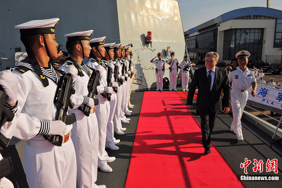 当地时间8月5日13时30分,中国海军“烟台”号护卫舰驶离罗马尼亚康斯坦察港。这是中罗建交63年来中国海军舰艇首次访问罗马尼亚。4天来,中尼两国海军进行了多层面友好交流,访问取得圆满成功。图为中国海军“烟台”舰访问罗马尼亚期间,罗国防部长多布里佐尤4日登舰参加甲板招待会。中新社发 米晋国 摄
