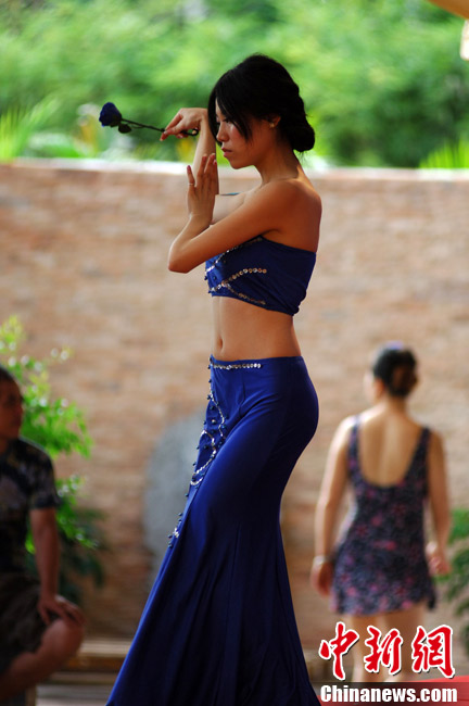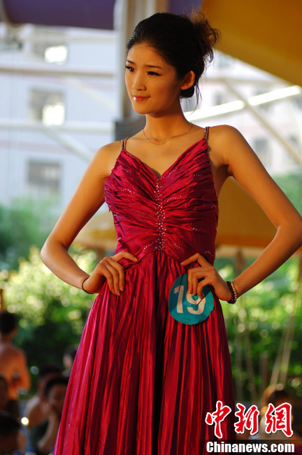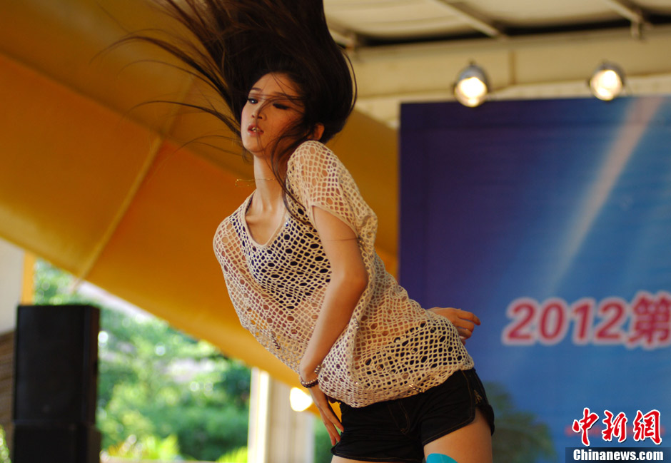 8月12日,以“文化海西·多彩世界”为主题的2012第39届世界旅游小姐中国福建赛区晋级选拔赛在福州鲸奇水上乐园举行,当天选手们通过自我展示、才艺展示、服装展示角逐名晋级名额。图为比赛现场。吕明 摄