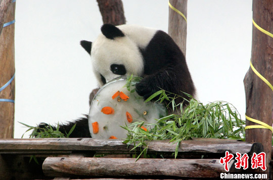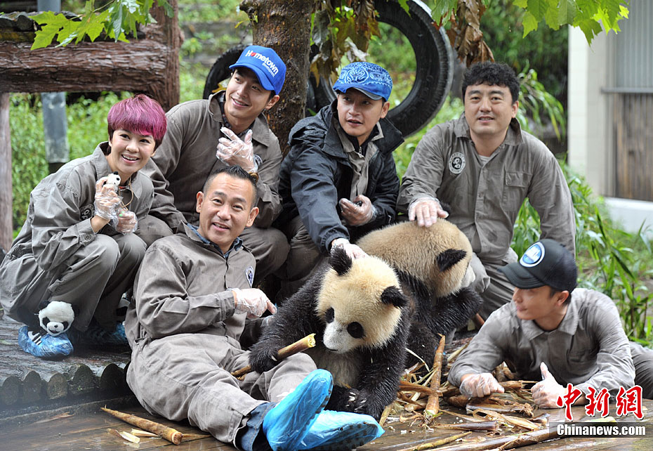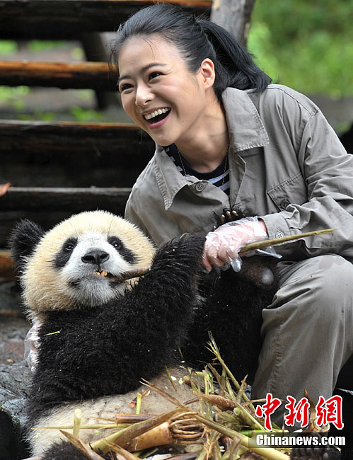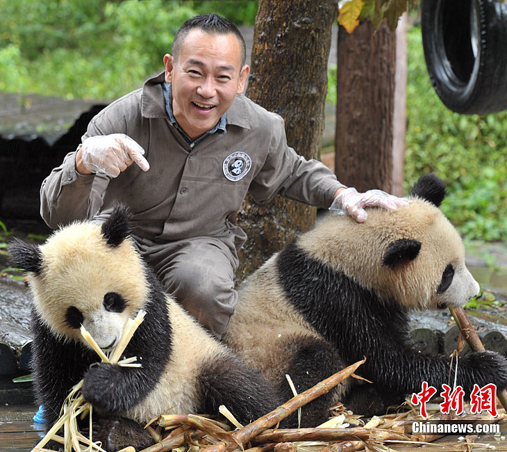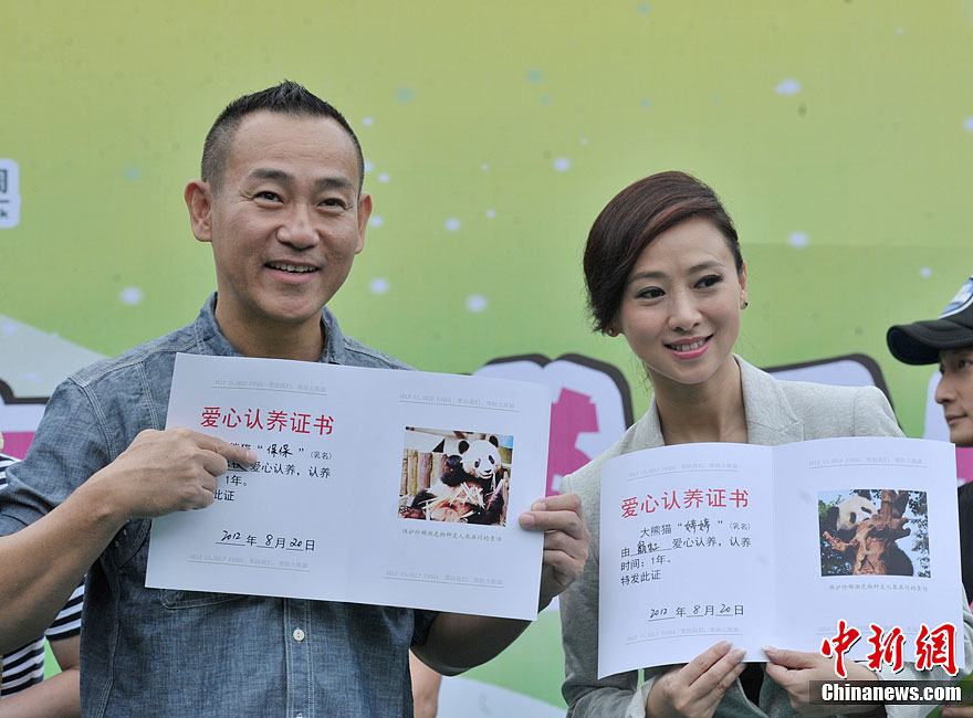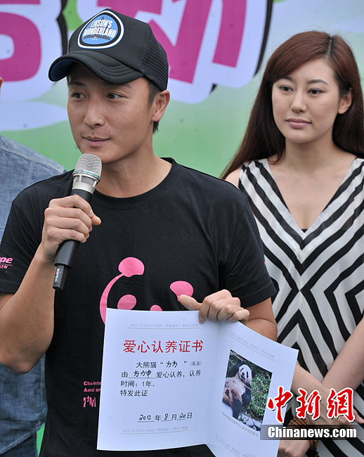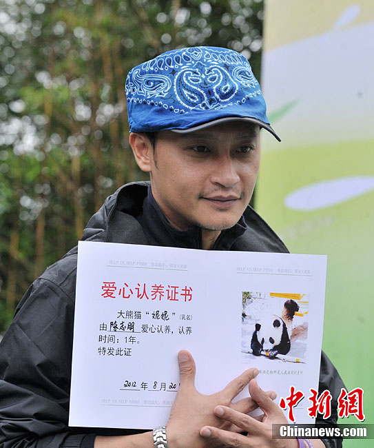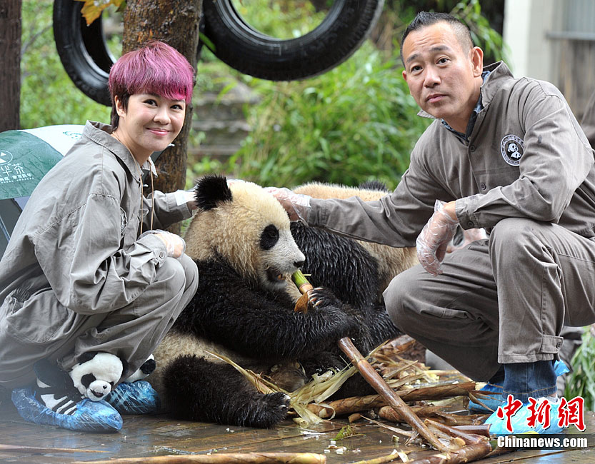 8月20日,参加“第五届中国·雅安国际熊猫·动物与自然电影周”闭幕式的大陆、港台明星陈志朋、林保怡、翁虹等17人来到四川雅安碧峰峡大熊猫基地与大熊猫亲密接触,并现场认养大熊猫。图为陈志朋与大熊猫。中新社发 刘忠俊 摄
