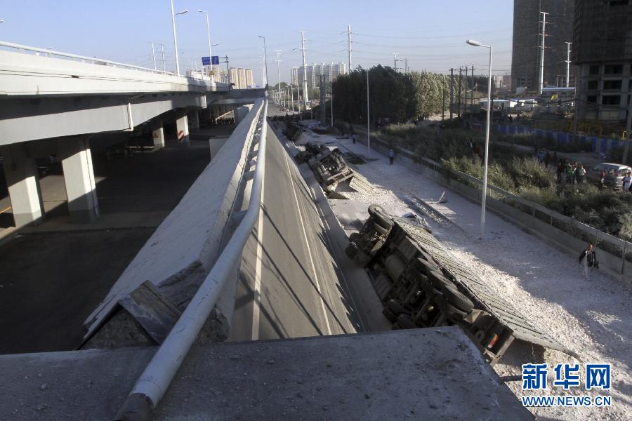 8月24日拍摄的发生断裂的大桥。当日5时30分左右,通车不到1年的哈尔滨阳明滩大桥发生断裂,致使4辆大货车坠桥。据消防部门消息,目前已造成3人死亡、5人受伤。图片来源:新华网