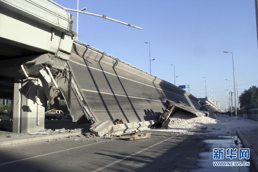 8月24日拍摄的发生断裂的大桥。当日5时30分左右,通车不到1年的哈尔滨阳明滩大桥发生断裂,致使4辆大货车坠桥。据消防部门消息,目前已造成3人死亡、5人受伤。图片来源:新华网