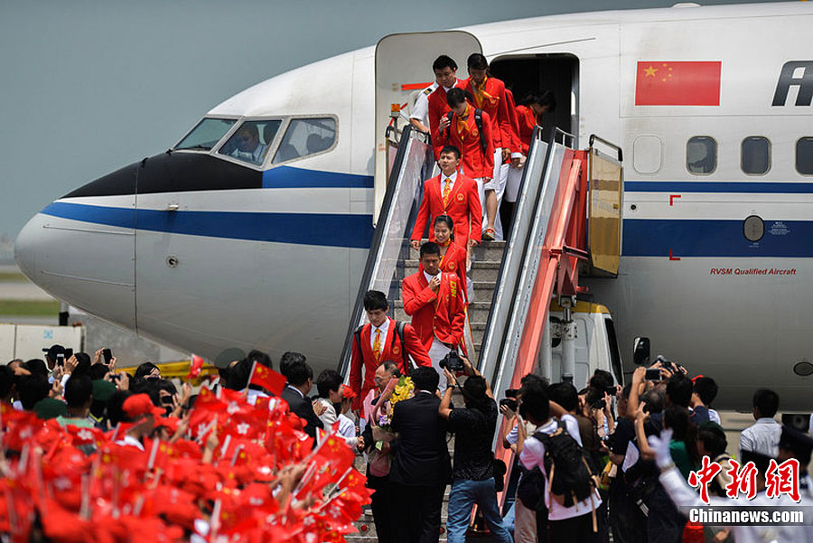 2012年伦敦奥运会内地金牌运动员代表团24日中午抵达香港国际机场,开始为期3天的访港行程。图片来源:东方IC 版权作品 请勿转载