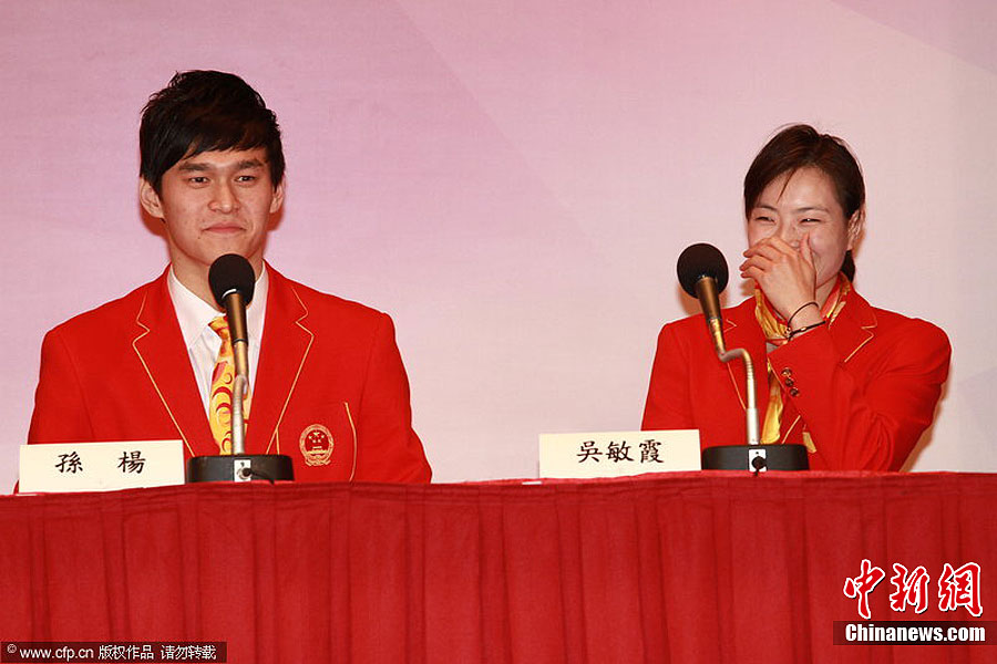 8月24日,敦奥运会夺得金牌的中国代表团运动员抵达香港举行记者会,运动员林丹、孙杨、吴敏霞和奥委会主席霍震霆等分享夺金经验。图为孙杨(左)和吴敏霞。图片来源:CFP视觉中国