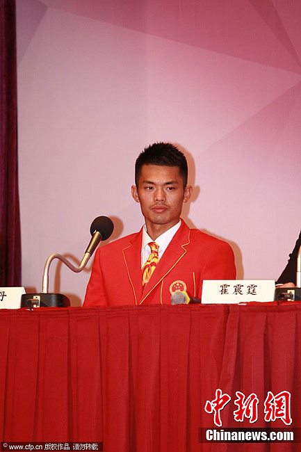 8月24日,敦奥运会夺得金牌的中国代表团运动员抵达香港举行记者会,运动员林丹、孙杨、吴敏霞和奥委会主席霍震霆等分享夺金经验。图为林丹在记者会现场。图片来源:CFP视觉中国