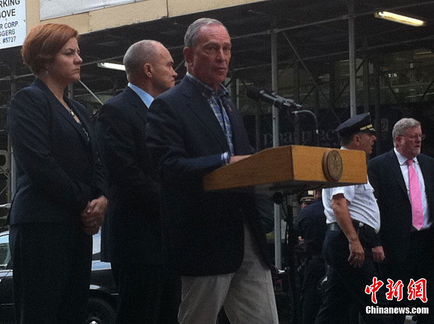 当地时间24日,纽约帝国大厦发生枪击案,造成十多人死伤。图为纽约市长布隆伯格在帝国大厦附近召开紧急记者会介绍枪击案进展。纽约警察局长凯利、纽约市议长柯魁英(Christine Quinn)等一同出席。李洋 摄