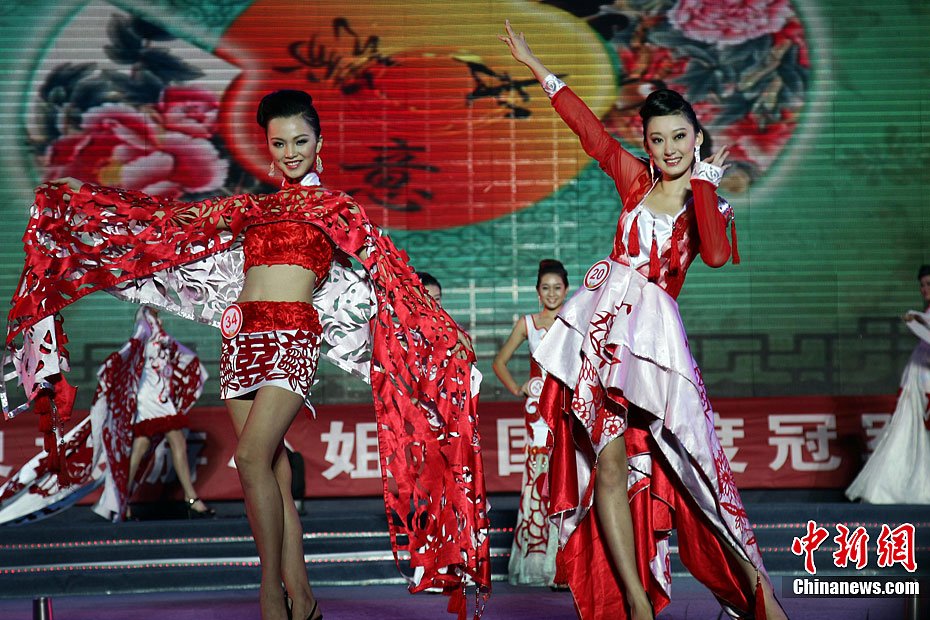 8月24日晚,2012世界旅游小姐中国年度冠军总决赛颁奖盛典在山西阳城凤西生态公园落幕,来自中国20个分赛区的36名选手,在此经过开场舞、民族服饰、泳装以及晚装四个部分的角逐。最终,来自山西的刘彦君夺得冠军,江西的徐瑶瑶获得亚军,北京的袁佳怡获季军。图为身着由剪纸艺术做出的性感纸衫的参赛选手们,吸引了众多前来的观赛嘉宾的目光。张云 摄