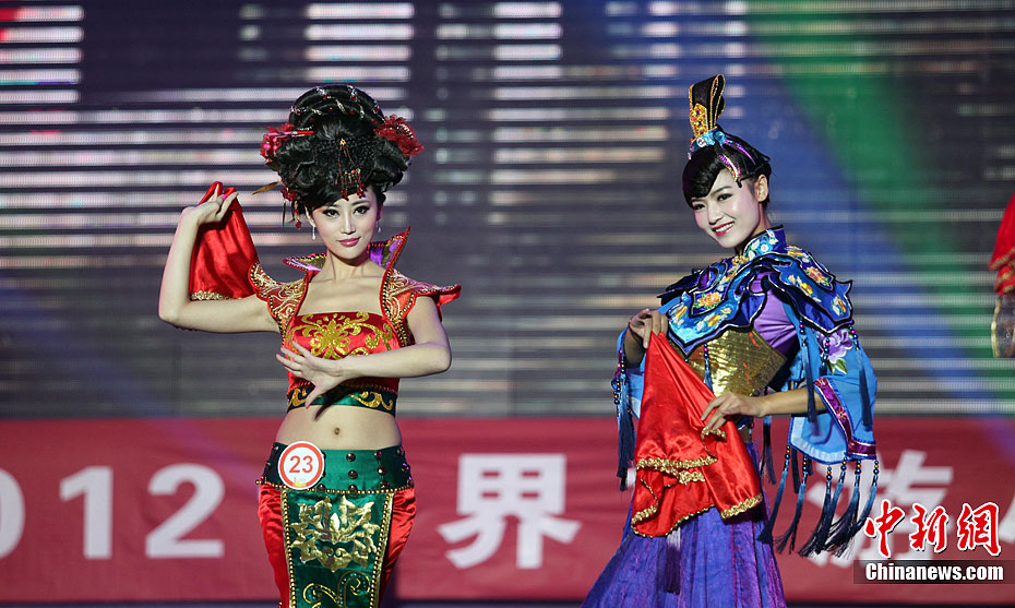 8月24日晚,2012世界旅游小姐中国年度冠军总决赛颁奖盛典在山西阳城凤西生态公园落幕,来自中国20个分赛区的36名选手,在此经过开场舞、民族服饰、泳装以及晚装四个部分的角逐。最终,来自山西的刘彦君夺得冠军,江西的徐瑶瑶获得亚军,北京的袁佳怡获季军。图为民族气息浓郁的服饰成为历来选美赛事中不可缺的亮点。张云 摄