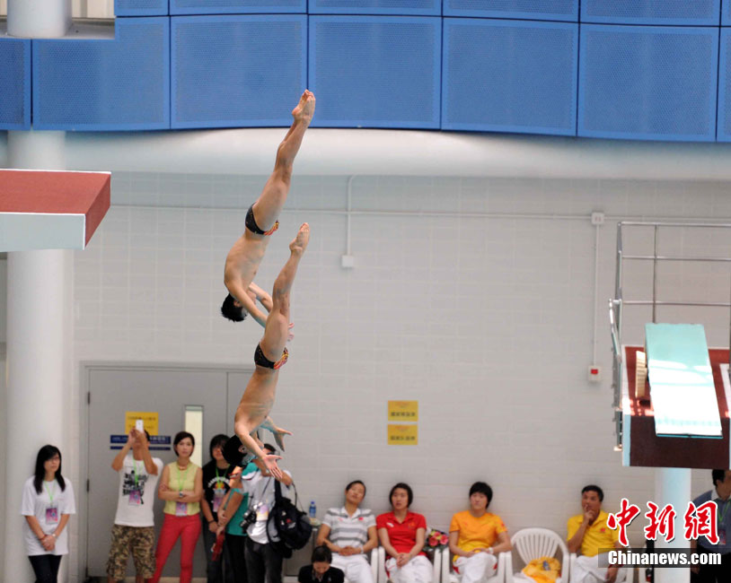 8月25日,曹缘与张雁全示范男子双人十米高台跳水表演。国家奥运金牌跳水运动员,当日早上在香港九龙公园示范表演。中新社发 谭达明 摄