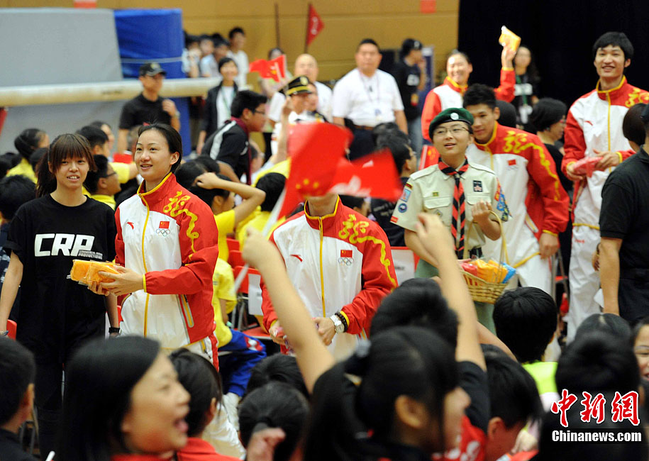 8月25日,2012年伦敦奥运会内地金牌运动员代表团访港进入第二天,部分竞走、体操、举重运动员在小西湾体育馆与数百名青少年交流互动,分享成功经验。现场,青少年还与运动员进行体育竞赛,同唱歌曲。金牌运动员的表演及派发礼品更令香港青少年兴奋不已。中新社发 任海霞 摄