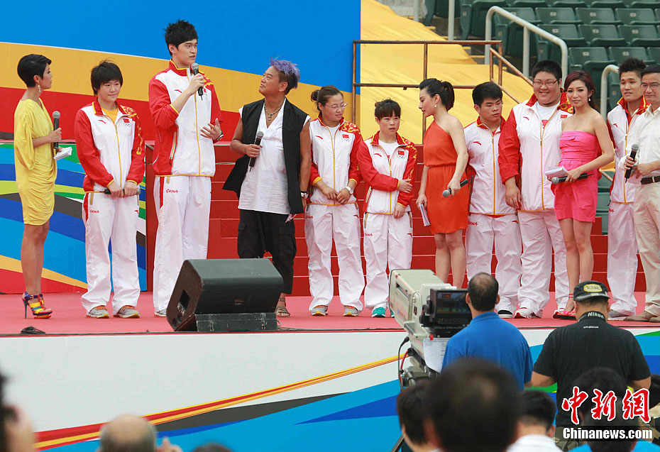 8月25日,“奥运金牌精英大汇演”在香港大球场举行,40多位国家队伦敦奥运金牌运动员与万名观众见面及交流演出。担任节目主持的著名艺人陈百祥、刘璇、陈芷菁、朱凯婷与奥运金牌孙杨、焦刘洋等交流心得分享成功感受。中新社发 洪少葵 摄