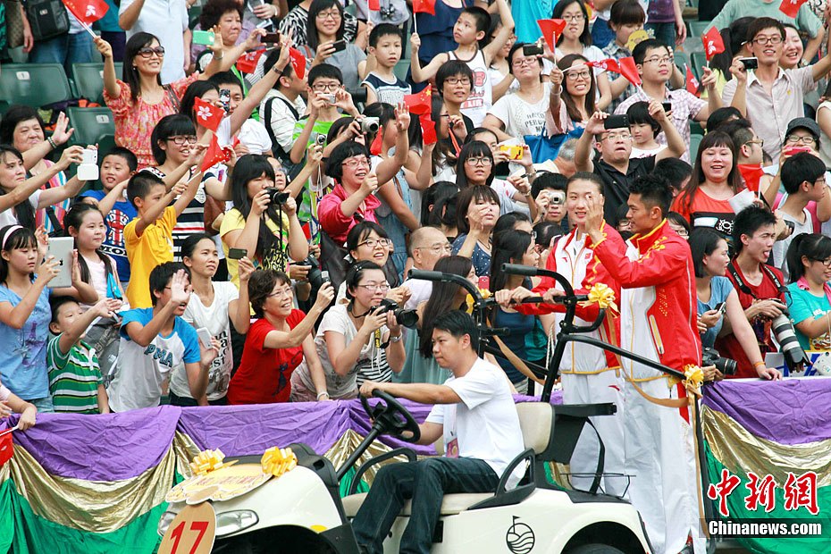 8月25日,“奥运金牌精英大汇演”在香港大球场举行,40多位国家队伦敦奥运金牌运动员与万名观众见面及交流演出。林丹乘车入场时受到热烈欢迎。中新社发 洪少葵 摄