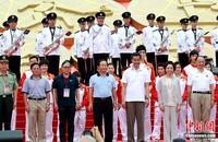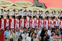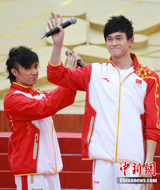 8月25日,“奥运金牌精英大汇演”在香港大球场举行,40多位国家队伦敦奥运金牌运动员与万名观众见面及交流演出。帅哥孙杨与歌星古巨基合唱《情歌王》博得阵阵掌声。中新社发 洪少葵 摄