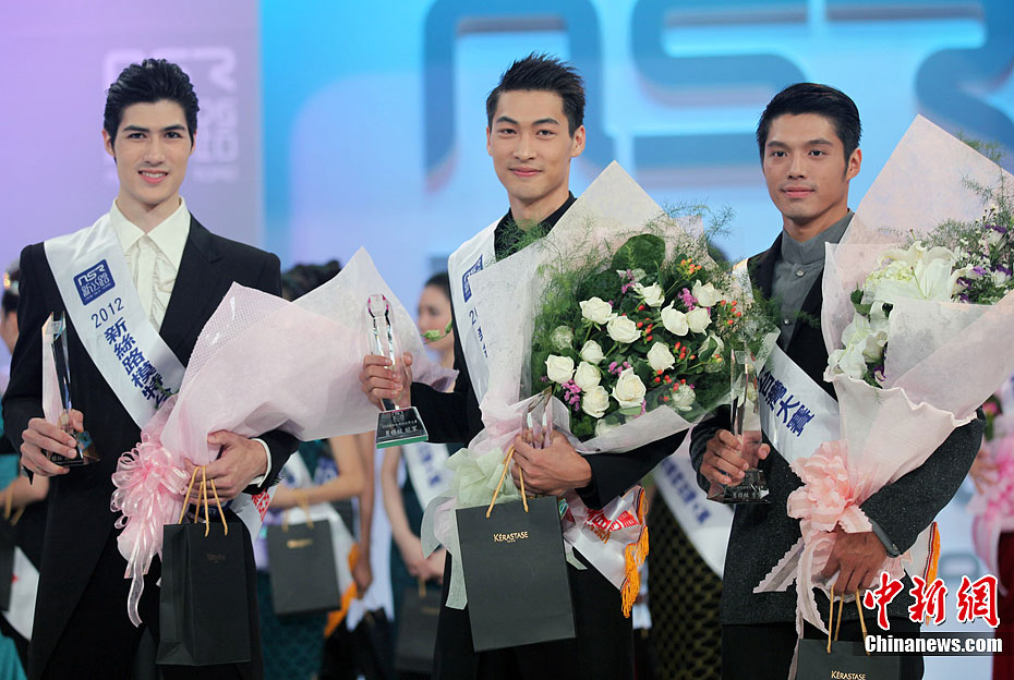 8月25日晚,第二届新丝路模特台湾大赛结果在台北揭晓。图为获得男模组冠军陈邦安(中)、亚军MATTHILL(左)、季军王盈凯(右)。中新社发 黄少华 摄