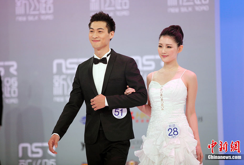 8月25日晚,第二届新丝路模特台湾大赛在台北举行,共有49名男女模特参赛。图为获得男模组冠军的陈邦安与超模组季军陈依函(右)在婚纱赛项中搭档。中新社发 黄少华 摄
