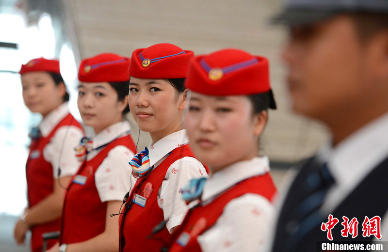8月26日上午9时50分,武汉火车站,由武汉开往深圳的1013次动车组服务员全部换上宝珠红工作装,新装较以前的工作装显得宽松得体,便于工作。色彩鲜艳、高贵优雅的新装成为武广高铁线路上一靓丽的风景。图片来源:东方IC 版权作品 请勿转载