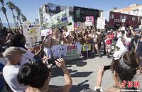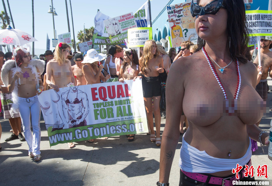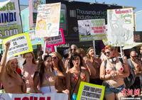 8月26日,一群袒胸露乳的女性高举标语牌在艳阳高照的加州洛杉矶威尼斯海滩示威。当天是“全国袒胸日”,该示威活动主张妇女与男性在公共场所有袒胸露背的相同宪法权利。中新社发 林戈 摄