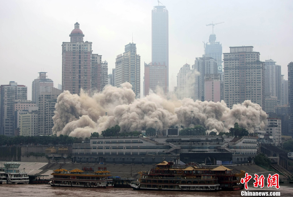 8月30日,重庆港客运大楼和三峡宾馆被爆破拆除,瞬间化为瓦砾。这两幢重庆朝天门地标性建筑正式谢幕,取而代之的将是一座投资210亿元人民币的现代化城市综合体“朝天扬帆”。朝天门是长江、嘉陵江的交汇处,是重庆一大地标。矗立于朝天门广场上的32层高楼“重庆港客运大楼”形如桅杆,紧邻其侧的便是“三峡宾馆”,这两栋建筑和朝天门码头构成了海内外游客对重庆的最初印象。中新社发 陈超 摄