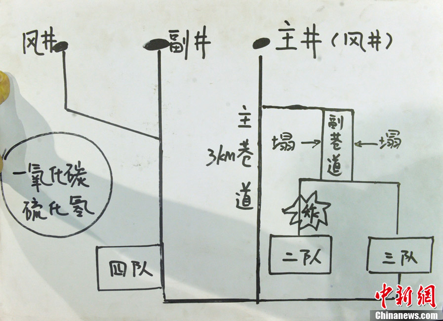 8月31日凌晨,四川攀枝花“8.29”矿难现场搜救还在紧张进行中。图为出事矿井下示意图。刘忠俊 摄