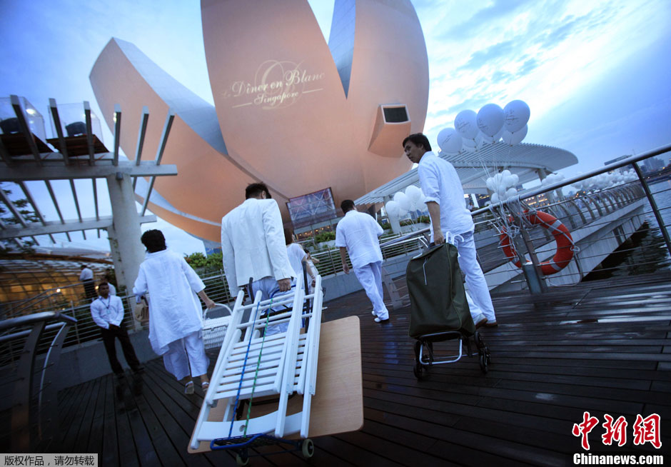 当地时间8月30日,新加坡艺术科学博物馆举行“白色晚餐”活动,这是这一活动首次在亚洲城市举行。参加这一活动的客人被要求身着白色礼服,自带白色椅子、桌子、餐具、食物以及饮料。
