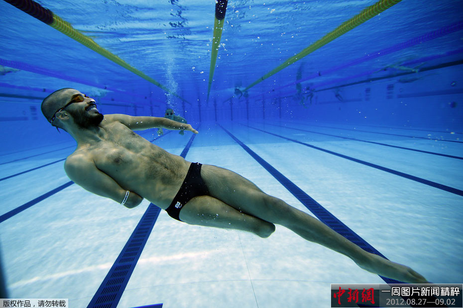 周一,巴西游泳运动员迪亚斯(Daniel Dias)在备战2012年伦敦残奥会时和摄影师开玩笑。患有先天性四肢畸形的迪亚斯曾在北京残奥会中夺得九枚奖牌,其中包括四枚金牌。