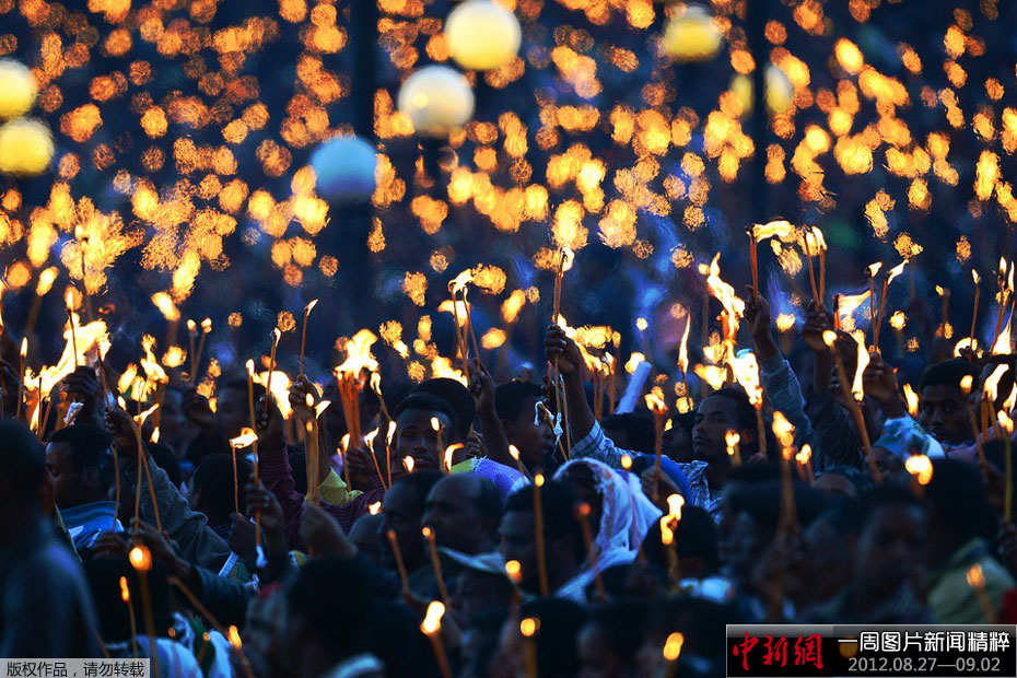 周四,埃塞俄比亚首都亚的斯亚贝巴,数万民众聚集在十字架广场(Meskel Square)上,为上周去世的总理梅莱斯(Meles Zenawi)哀悼。图为为梅莱斯守夜的哀悼者。