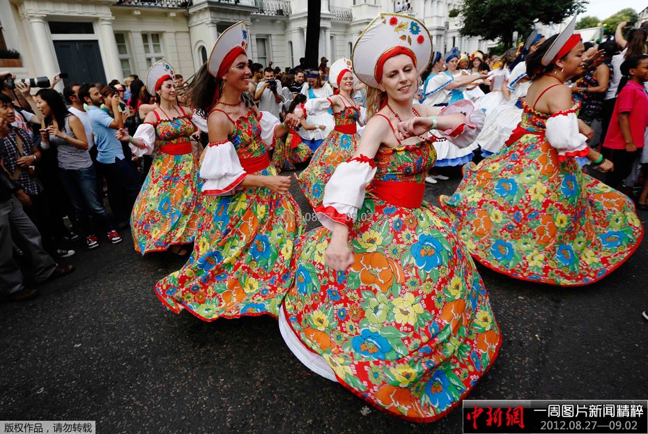 当地时间8月26日,英国西伦敦诺丁山狂欢节盛大举行。图为舞者街头盛装表演。