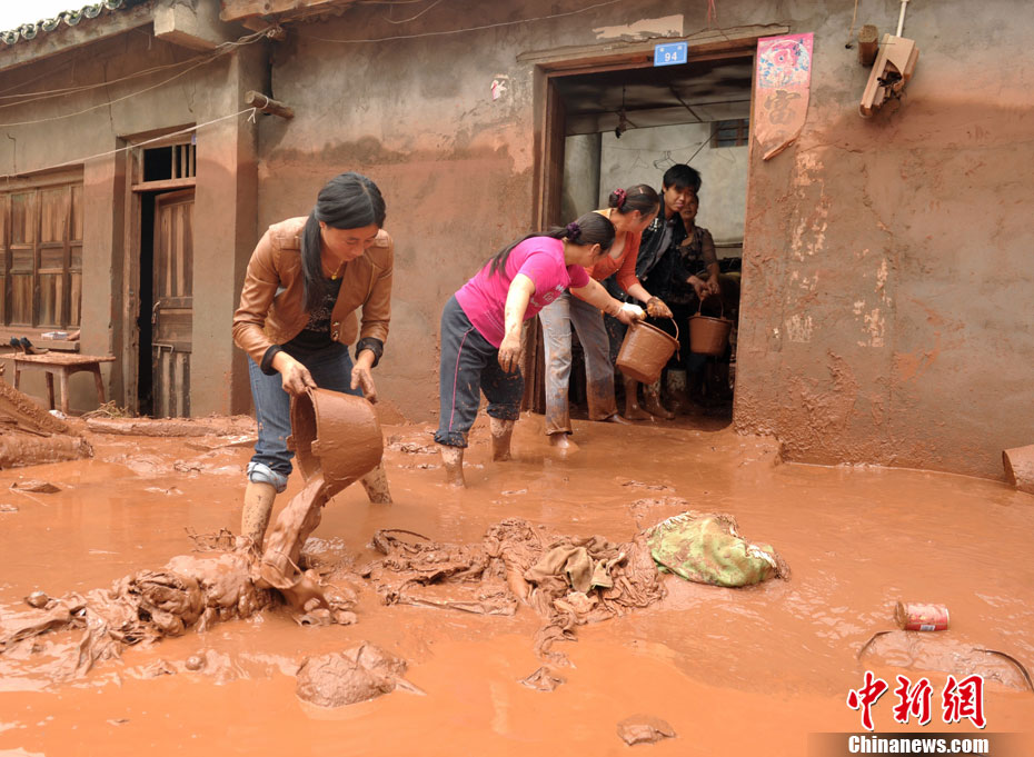 9月2日,四川凉山州冕宁县泸沽镇境内的孙水河洪水正在慢慢消退,洪水造成该镇南街、北街上千余户居民受灾严重,泸沽镇老桥被冲毁。目前,当地抢险救灾工作正在紧张进行中。图为受灾民众正在展开自救清淤。中新社发 刘忠俊 摄