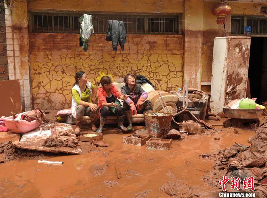 9月2日,四川凉山州冕宁县泸沽镇境内的孙水河洪水正在慢慢消退,洪水造成该镇南街、北街上千余户居民受灾严重,泸沽镇老桥被冲毁。目前,当地抢险救灾工作正在紧张进行中。图为三位受灾民众坐在自家门前小憩。中新社发 刘忠俊 摄