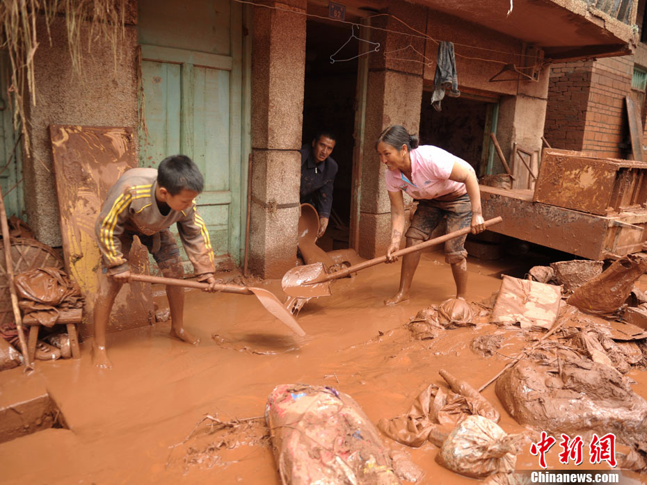 9月2日,四川凉山州冕宁县泸沽镇境内的孙水河洪水正在慢慢消退,洪水造成该镇南街、北街上千余户居民受灾严重,泸沽镇老桥被冲毁。目前,当地抢险救灾工作正在紧张进行中。图为孩子与母亲正在自家门前清淤。中新社发 刘忠俊 摄