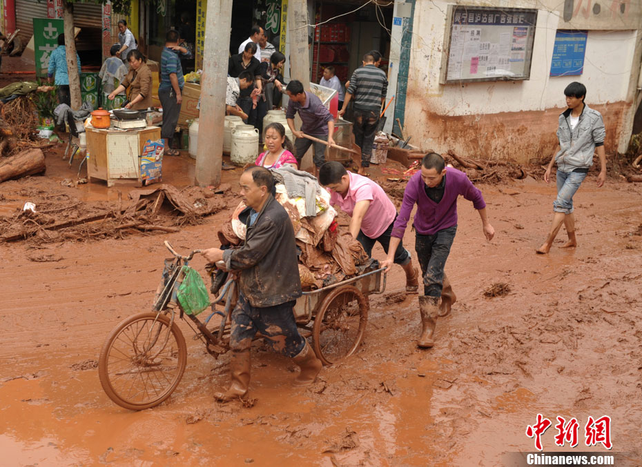 9月2日,四川凉山州冕宁县泸沽镇境内的孙水河洪水正在慢慢消退,洪水造成该镇南街、北街上千余户居民受灾严重,泸沽镇老桥被冲毁。目前,当地抢险救灾工作正在紧张进行中。图为受灾民众正在转移财物。中新社发 刘忠俊 摄