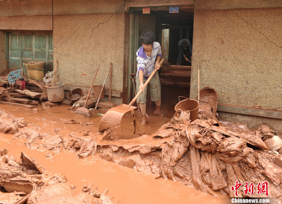 9月2日,四川凉山州冕宁县泸沽镇境内的孙水河洪水正在慢慢消退,洪水造成该镇南街、北街上千余户居民受灾严重,泸沽镇老桥被冲毁。目前,当地抢险救灾工作正在紧张进行中。图为南街上正在清淤的孩子。中新社发 刘忠俊 摄