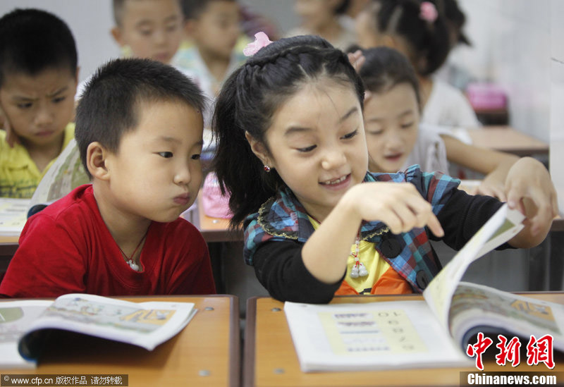 9月1日,河南洛阳市实验小学,新生开学第一天。课堂上的第一个同桌。张晓理 摄 图片来源:CFP视觉中国