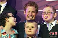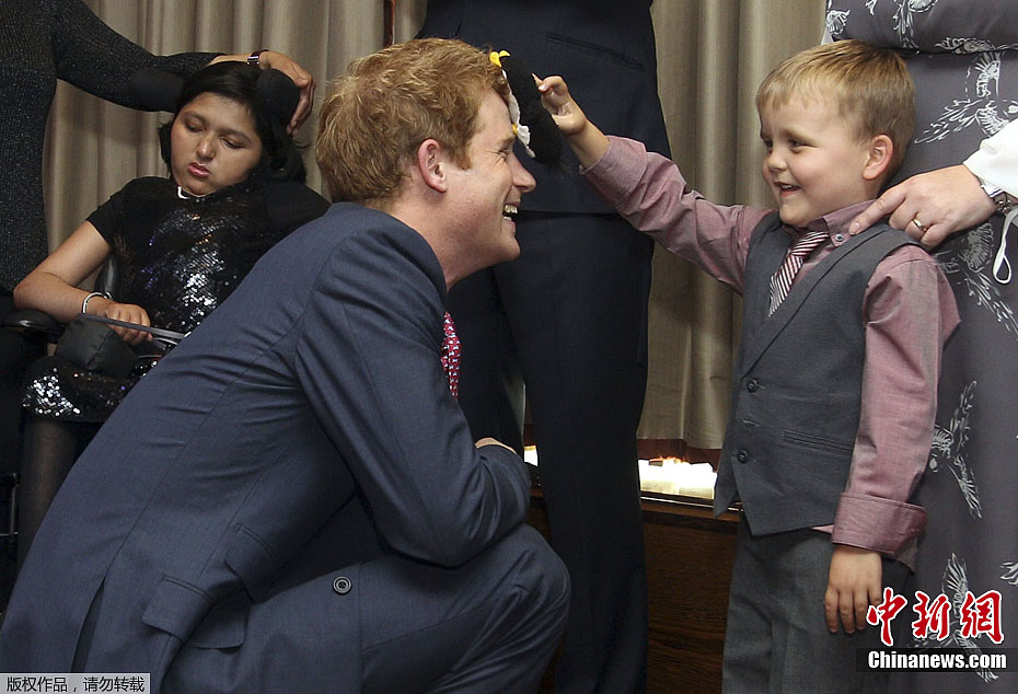 9月3日,经历拉斯维加斯裸照事件后的英国哈里王子首次公开露面,在伦敦出席一场有关患病儿童的慈善活动。在整个活动中哈里王子显得十分自然,不断微笑地与孩子交流互动,丝毫没有紧张的表情。图为哈里王子与孩子互动。