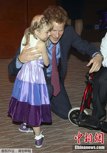 9月3日,经历拉斯维加斯裸照事件后的英国哈里王子首次公开露面,在伦敦出席一场有关患病儿童的慈善活动。在整个活动中哈里王子显得十分自然,不断微笑地与孩子交流互动,丝毫没有紧张的表情。图为哈里王子与孩子互动。